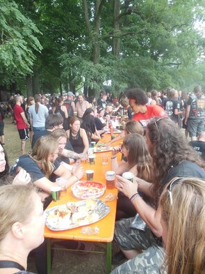 Endlich verabschiedeten wir uns von der Zeltbühne, denn die Entscheidung Harmony Dies oder Mourning Beloveth fiel zugunsten der Iren aus. Bevor diese ihr Set begannen, musste ich unbedingt mal beim Eis-Auto vorbeischauen, mit dem ein ortsansässiger Italiener seine Runden übers Gelände drehte. Der hatte ein übelst leckeres DSBM-Eis: aschgrau mit blutroten Kirschen drin. Den Namen der Kreation hab ich vergessen, der Eismann wusste auch nichts von Black Metal und dessen Unterspielarten, genial war es trotzdem. Ebenso genial war die Stimmung, die Mourning Beloveth mit ihrem leicht folkig angehauchten Death-Doom erzeugen konnte – eine Mischung aus Gänsehaut und Amüsement, weil der zweite Sänger sich mangels Instrument und Mikroständer nur an der Bierflasche festhalten konnte und ein wenig so wirkte wie der besoffene Kumpel, der einfach nicht gehen will, auch wenn alle versuchen, ihn zu ignorieren. Sein Cleangesang wäre nüchtern wahrscheinlich nur halb so leidenschaftlich geraten, von daher passte das so schon gut zusammen.