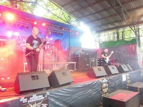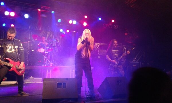 Über Leute mit leistungsstarken Akkus im Smartphone sprach sich herum, dass die Spanier von Serrabulho nicht spielen können, weil da im engeren Umfeld etwas Tragisches geschehen ist. Ich kenn die Band nicht, schade ist es aber trotzdem. So wurde die traditionelle Kaffee&Kuchentafel etwas eher eröffnet und 5 Stabbed 4 Corpses gingen auch ein wenig zeitiger auf die Bretter, um zünftigen Frühstücksgrind darzubieten. Gerüchten zufolge handelt es sich um eins der letzten Konzerte mit Basserin Mella und sie strahlte die ganze Zeit, was die Truppe noch sympathischer machte als sowieso schon.