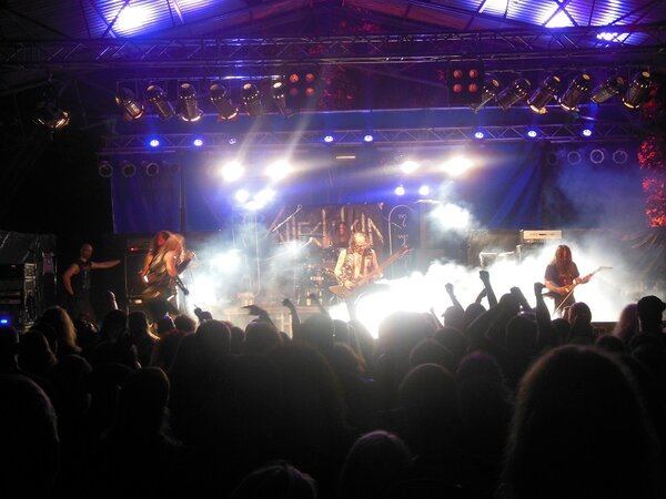 Kleine Anekdote am Rande: Die traditionelle Tracht (sprich: Kutten, Nieten und dergleichen) ist irgendwo am Flughafen hängen geblieben. Innerhalb einer Stunde konnten allerdings auf dem Gelände diverse Dinge von Fans zusammengeborgt werden, sodass die Herren nicht „nackt“ auf der Bühne stehen mussten. Großartige Aktion. (j)