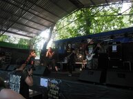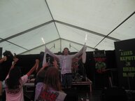 Rüber gings dann zur großen Bühne, die umringt ist von hohen Bäumen und daher eher wenig unerwünschten Lichteinfall bietet. Schön, dass hier und da auch Bänke zum Sitzen angeboten werden und die Bäume auch zum Abstützen einladen. Wird im Alter ja immer wichtiger.
