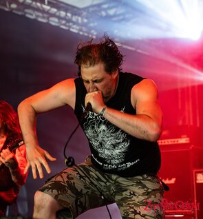 Das förderte auch den Bewegungsdrang von Chef Olaf, der mir verbal mehrere Textpassagen nachdrücklich in die Ohrmuschel tätowierte, während er Fäuste schwingend und diabolisch grinsend einfach nur das fühlte, was das komplette Infield beseelte: Pure Death Metal- Energie! Es lag sicherlich auch am farblich passenden Schwarzbier, aber das was hier in Schlotheim passierte war direkt magisch und wenn man denn möchte, toppte die Nummer auch haarscharf die wahnsinnig gute Show von Napalm Death.[Phillip]