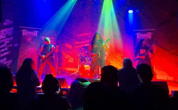 Mit einer Wagenladung Vorschusslorbeeren seitens des Chef-Olafs ausgestattet, durften dann KHNVM auf die Bühne. Bandboss Showmik Das möchte mit seiner Drei-Mann-Live-Verstärkung kosmisch angehauchten Death Metal der moderneren alten Schule unters Volk bringen. Auf Platte, insbesondere beim jüngst erschienenen Album Cosmocrator, funktioniert das sehr gut und nun war ich dementsprechend gespannt, ob das live nicht sogar noch besser rüberkommt. Ich wurde leider bitter enttäuscht, weise die Ursache aber deutlich von der Band. Es war mal wieder der dünne Gitarrensound, der den Gig unausgegoren erscheinen ließ. Auf der Bühne gaben sich KHNVM sichtlich Mühe.
