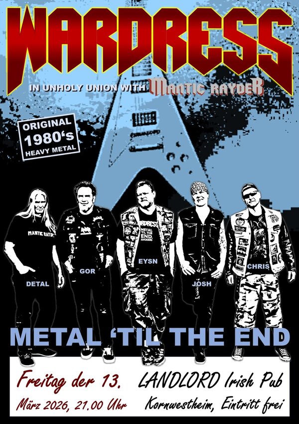 Nun hatte ich ja schon mit der Veröffentlichung des WARDRESS-Albums Metal ’Til The End einen Narren an der Kombo gefressen, was auch ein Interview nach sich zog. Ich war jedoch bass erstaunt, als ich die Nachricht bekam, dass besagte Combo in eben jenem Irish Pub, genannt „The Landlord“, aufzuspielen gedachte. Klar, dass der Gig für mich zum Pflichtprogramm wurde. Nun wohnt Sänger Erich ja ebenfalls in Kornwestheim und Gitarrist Gor stammt auch von hier. Demzufolge konnte die Trumpfkarte ‚Heimvorteil‘ hier gut ausgespielt werden. Nur der Rest der Band hockt im Raum Frankfurt.
