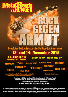 Am 13. und 14. November zeigen Metalheads und Fans der Rockmusik wieder ihr großes Herz. Das Benefizfestival Rock gegen Armut im Rahmen von Metalheads vs. Hunger steigt zum fünften Mal. Insgesamt stehen zwölf Bands aus ganz Deutschland, Frankreich und Österreich auf der Bühne und rocken für den guten Zweck.