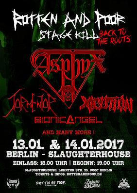 Der ROTTEN AND POOR STAGE KILL 2017 wird vom 13. bis 14. Januar 2017 im Berliner Slaughterhouse (nahe dem Hauptbahnhof) stattfinden. Es wird für jeden Tag nur Tagestickets geben. - Diese werden demnächst zum Preis von 30€ zzgl. Gebühren in den Vorverkauf gehen und auf 150 Stk. pro Tag limitiert sein. Mehr Infos dazu folgen !