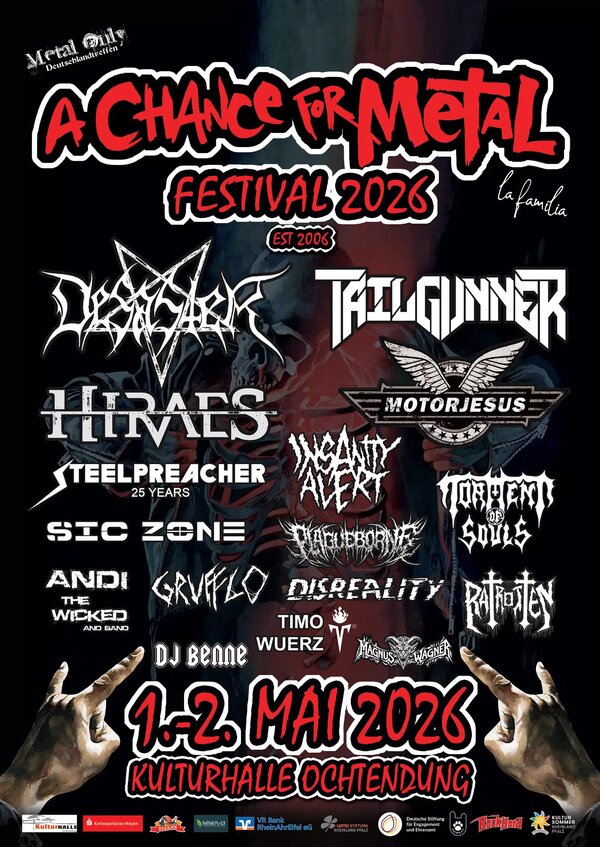 Im Jahr 2005 jedenfalls befand sich die nähere Umgebung von Koblenz wohl in einer ähnlichen Situation und beschloss nicht zu resignieren, sondern selbst zum Akteur zu werden. Ein Verein zur Unterstützung der untergründigen harten Klänge wurde gegründet und bereits ein Jahr später wurde das erste A CHANCE FOR METAL FESTIVAL begangen. Seitdem wird die Kulturarbeit jährlich fortgeführt und der Gedanke “Von Metalheads für Metalheads!” groß geschrieben.